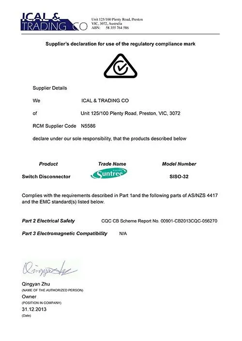 Изолятор постоянного тока, произведенный компанией Zhejiang Xinchi Electric Co., Ltd., прошел сертификацию RCM Австралии, используя новейшую технологию гашения дуги, водонепроницаемости и защиты от пыли для улучшения характеристик продукта.